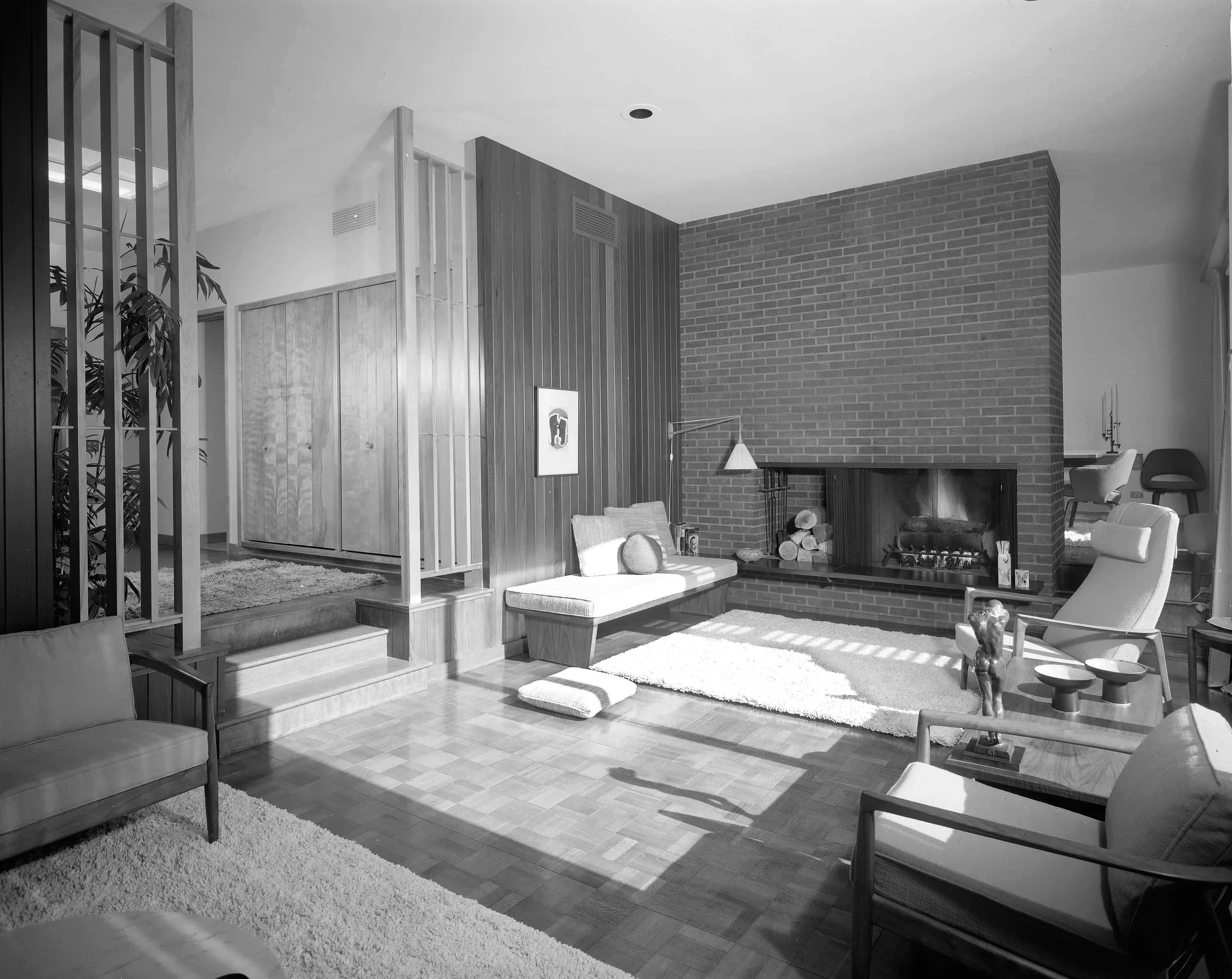 Interior view of living room and fireplace in Teplinsky residence in Highland Park, Illinois, 1966. Courtesy Chicago History Museum.Portrait of William and George Fred Keck, 1947.